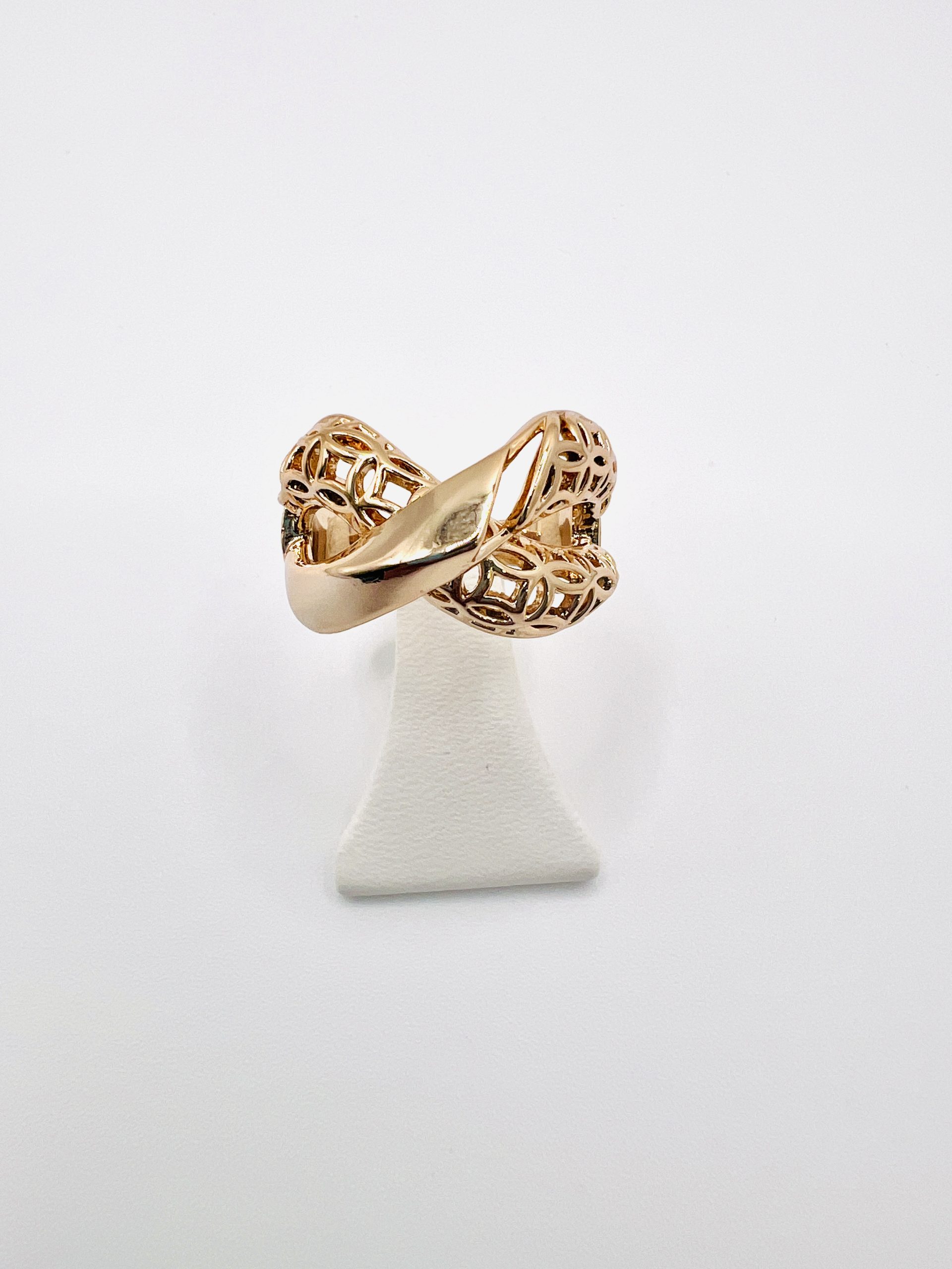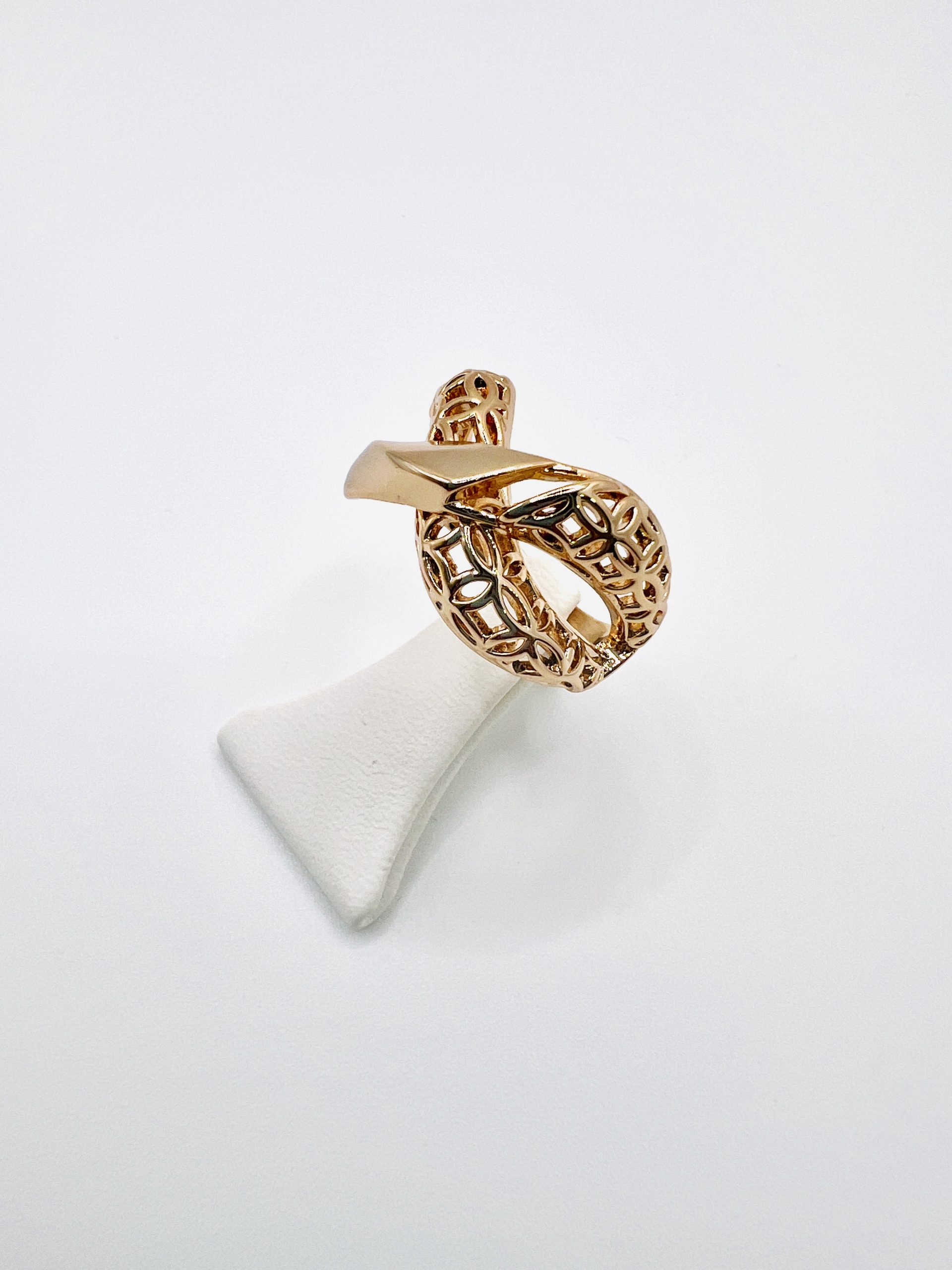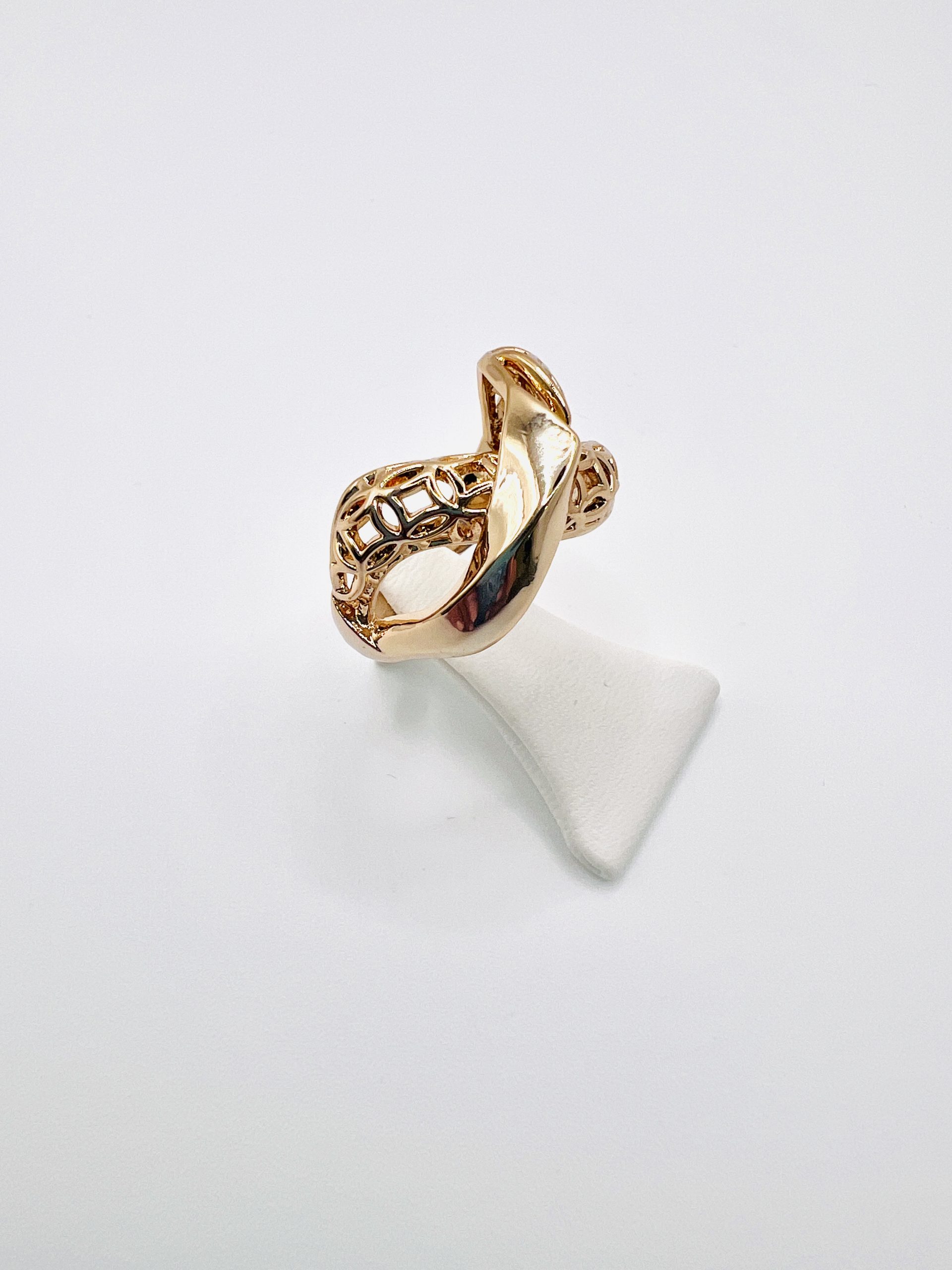 Anel dourado trançado, efeito infinito, em semijóia.