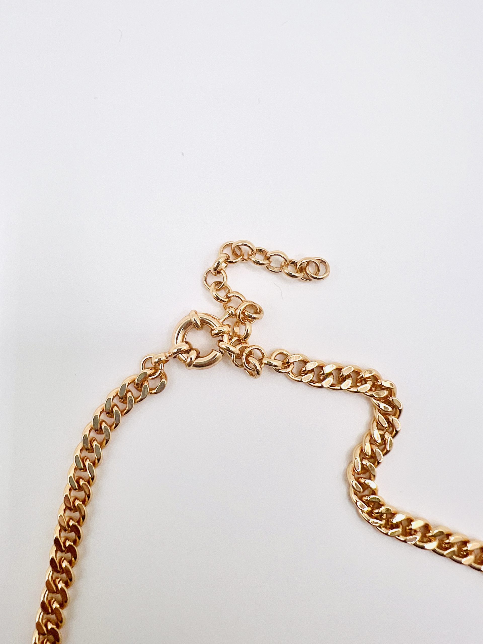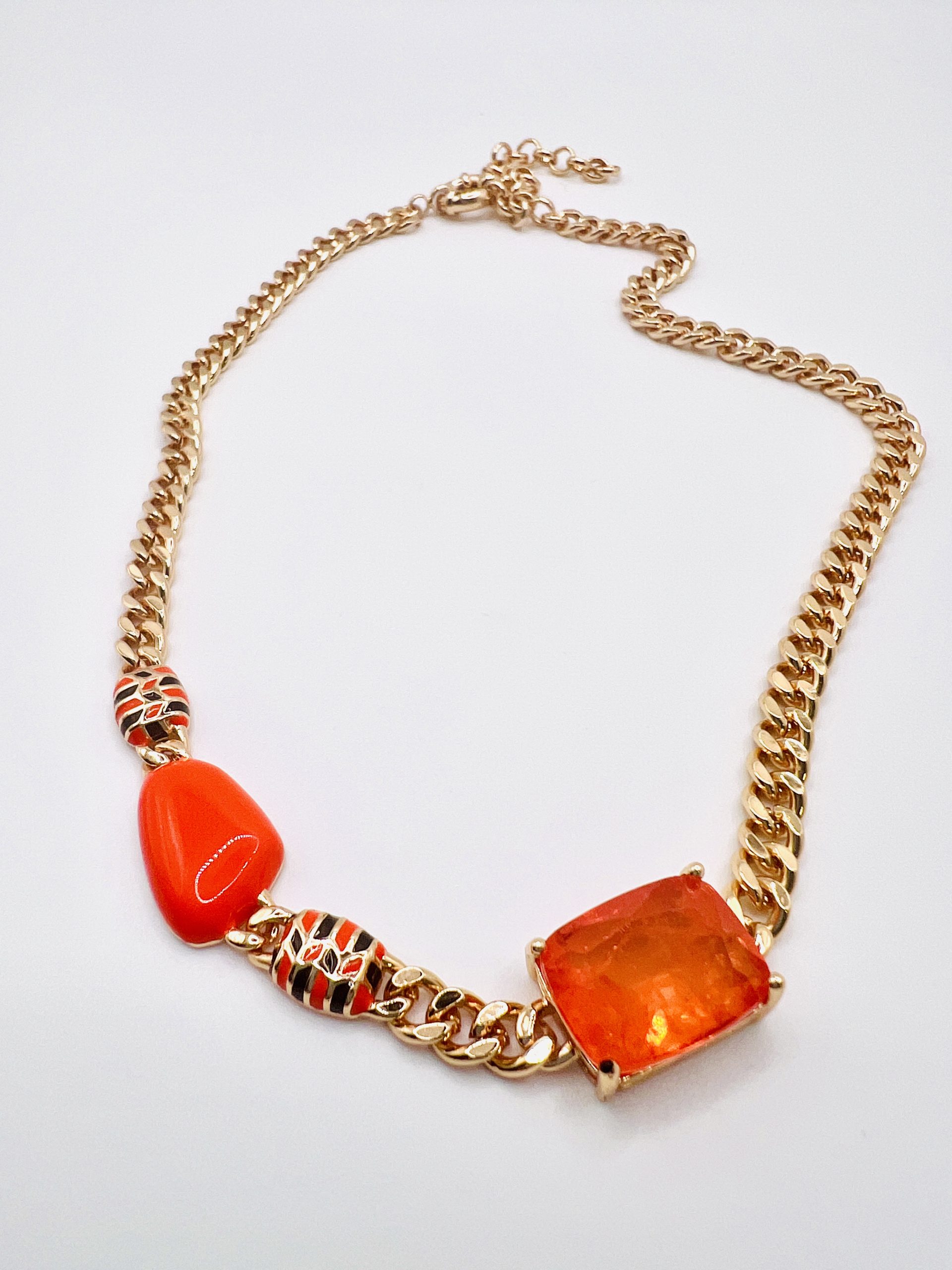 Colar de uso curto, malha barbela com pedra laranja, em semijóia.
