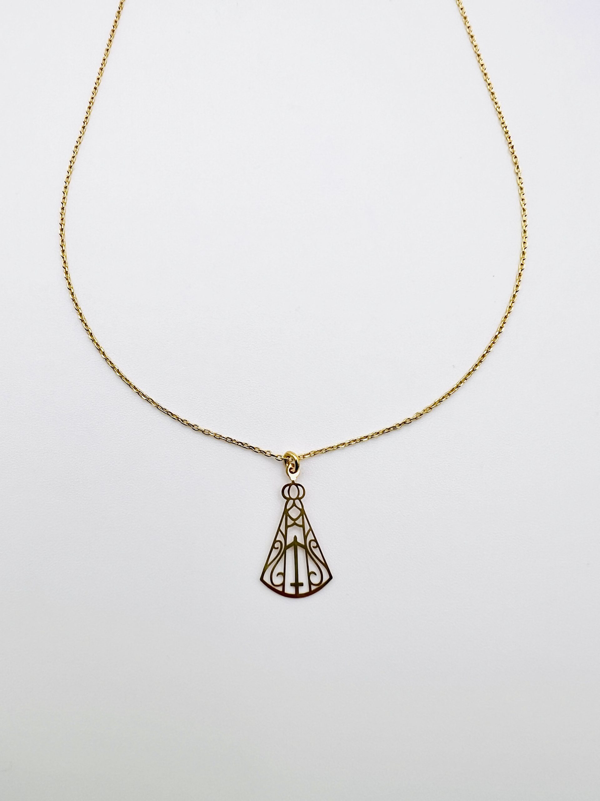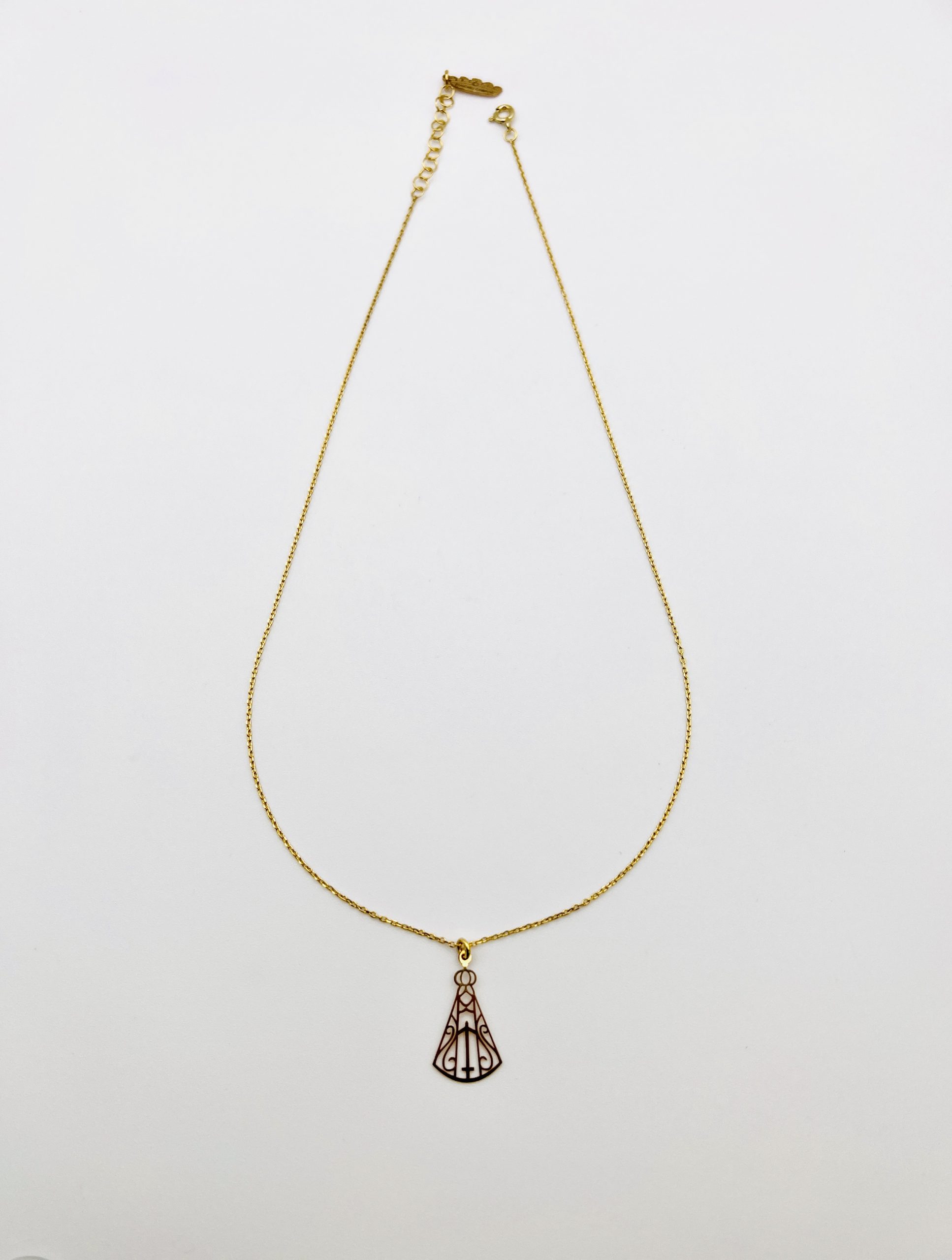 Colar Blessing em prata de lei, banhado a ouro amarelo. Joia com a imagem da Nossa Senhora de Fátima. Um amuleto que representa a Virgem Maria, símbolo de proteção, pureza e santidade. O colar para a acompanhar todos os dias.