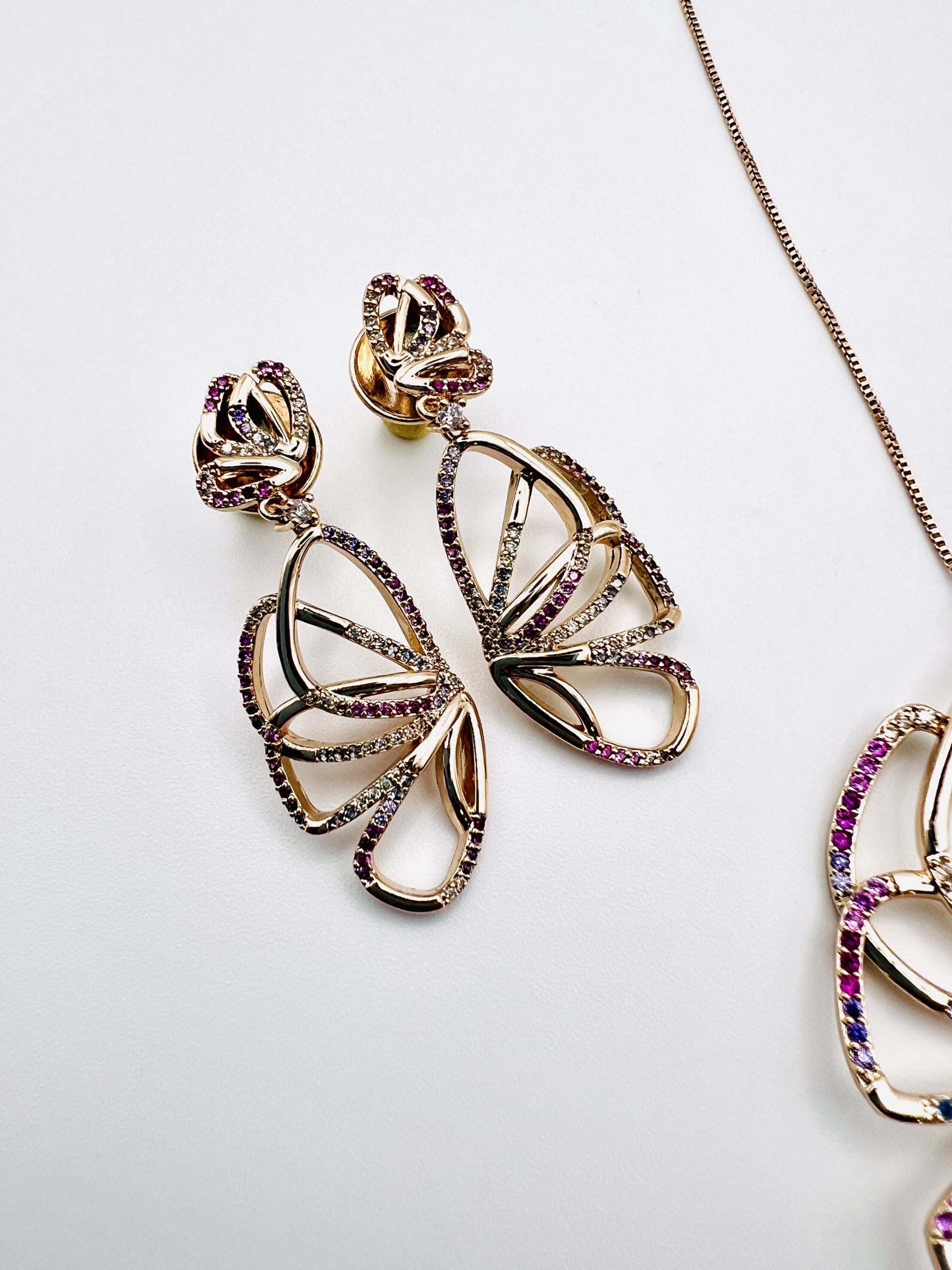 Colar e brincos Borboleta, com zircónias multicoloridas, em semijóia.