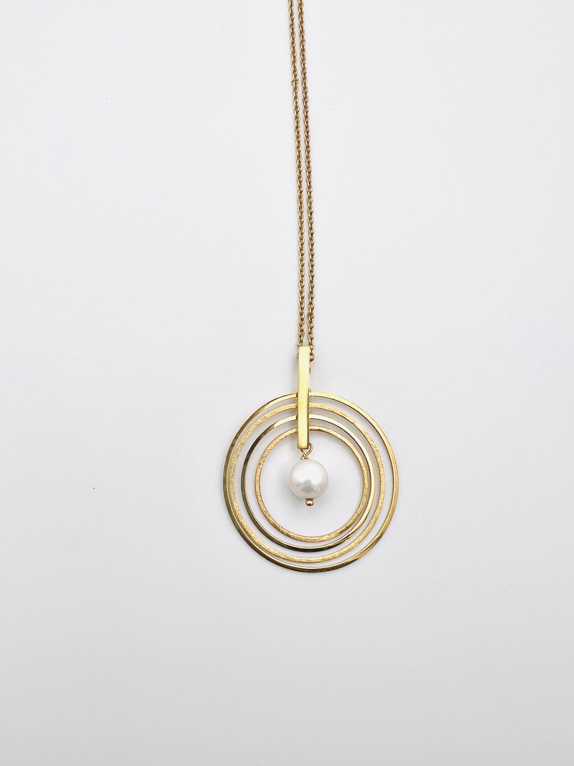 Colar Gravity em prata de lei, banhado a ouro amarelo, com pérola. Esta joia é perfeita para realçar qualquer look arrojado! A pérola representa feminilidade, unidade e delicadeza. Os anéis soltos remetem para o dinamismo e a leveza.