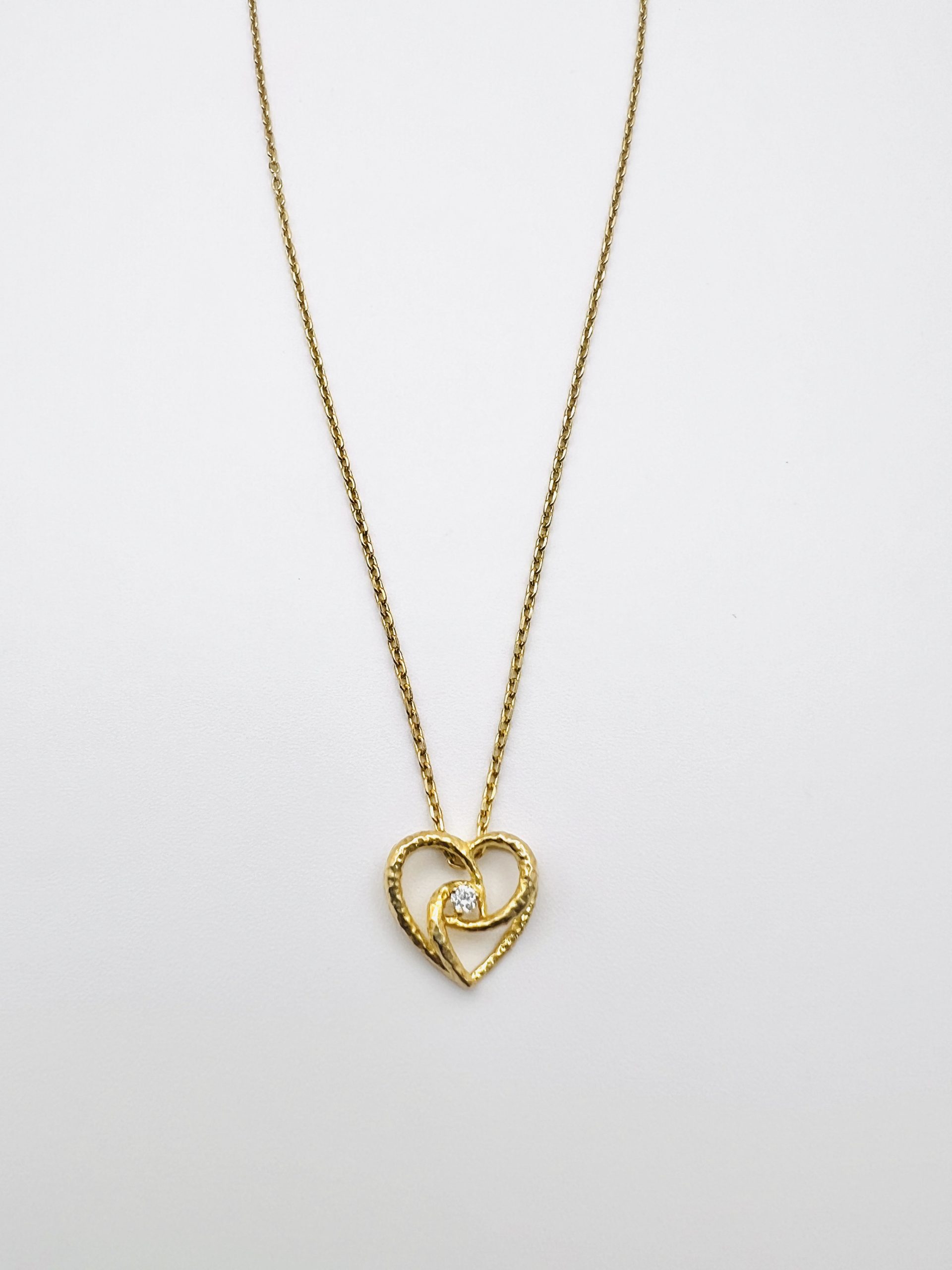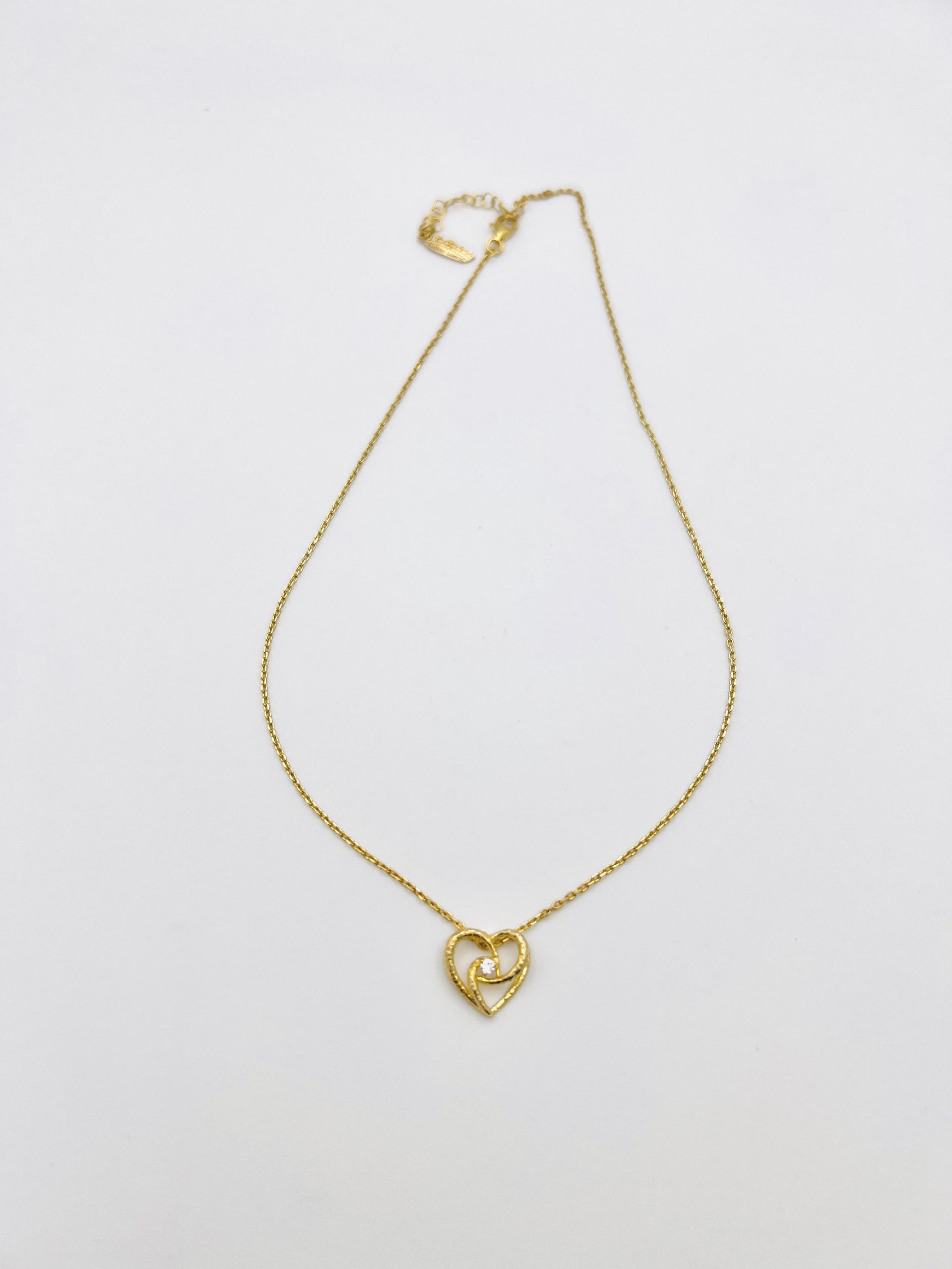 Colar História de Amor, em prata de lei, banhado a ouro amarelo, com zircónias branca. Joia com finas linhas que entrelaçadas criam um delicado coração. A zircónia no centro representa o ponto focal da paixão. História de Amor é o testemunho da beleza única que cada casal partilha.