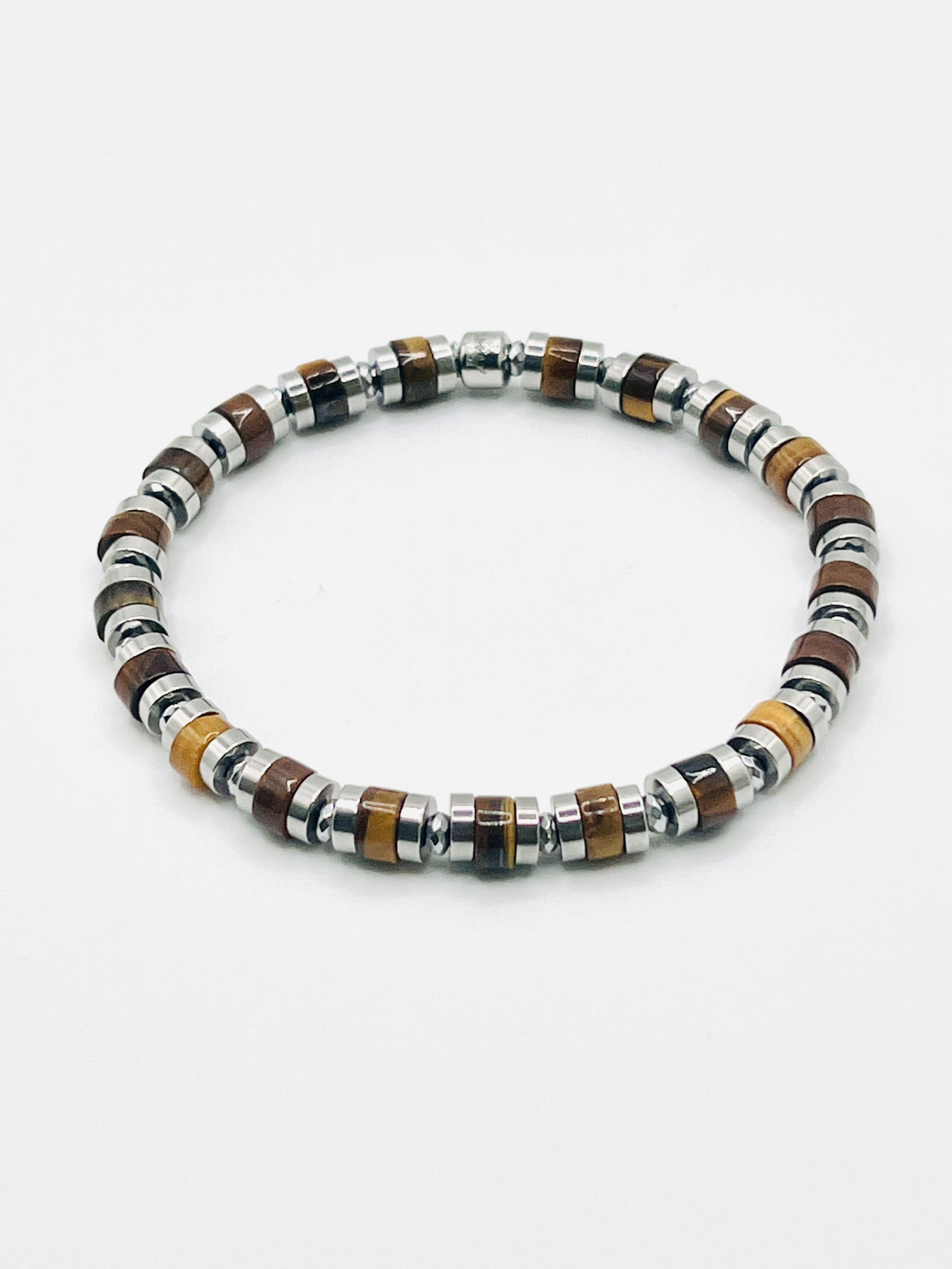 Pulseira elástica de aço prateado e peças olho de tigre. Com fecho prateado com gravacao da marca. Elástico invisivel, forte e transparente.