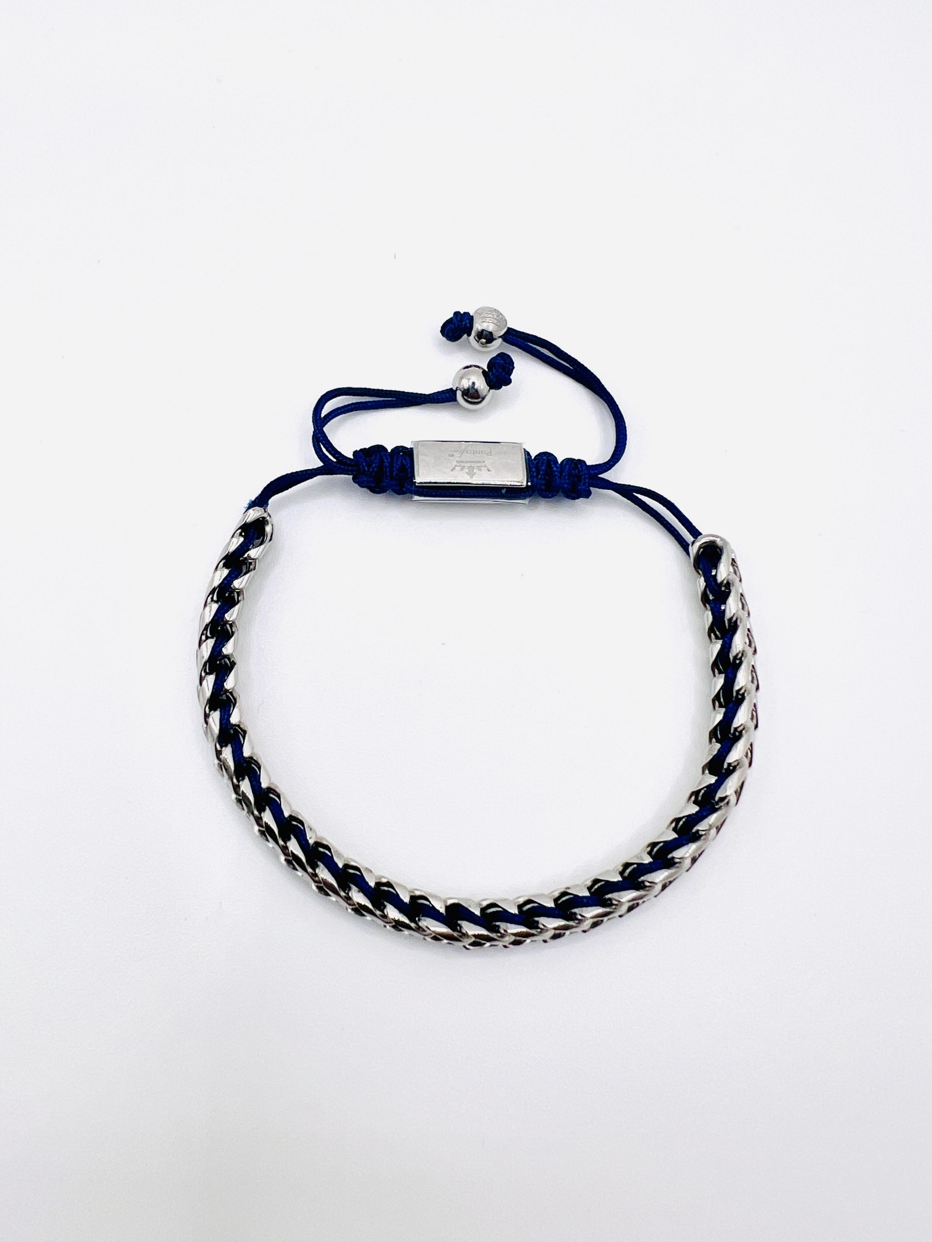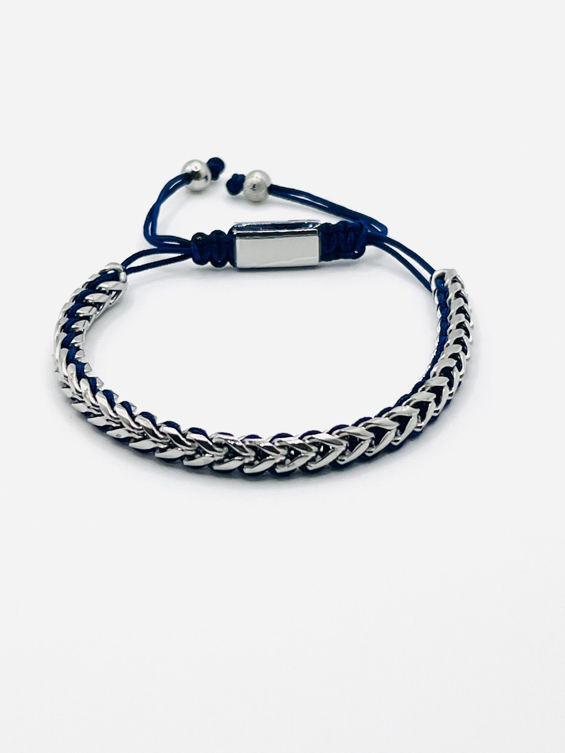 Pulseira aço prateado, com fio azul, ajustável, modelo trança.
