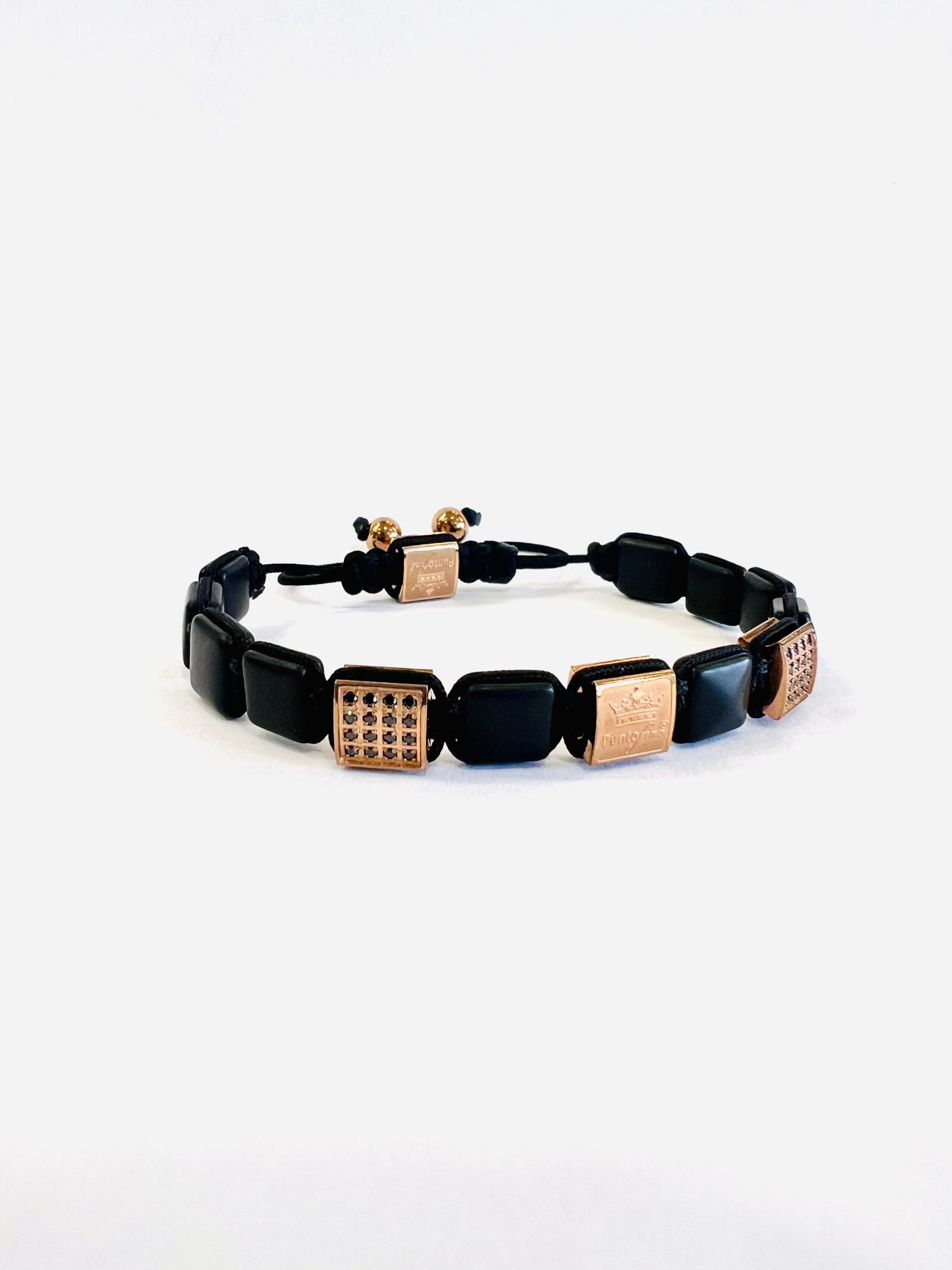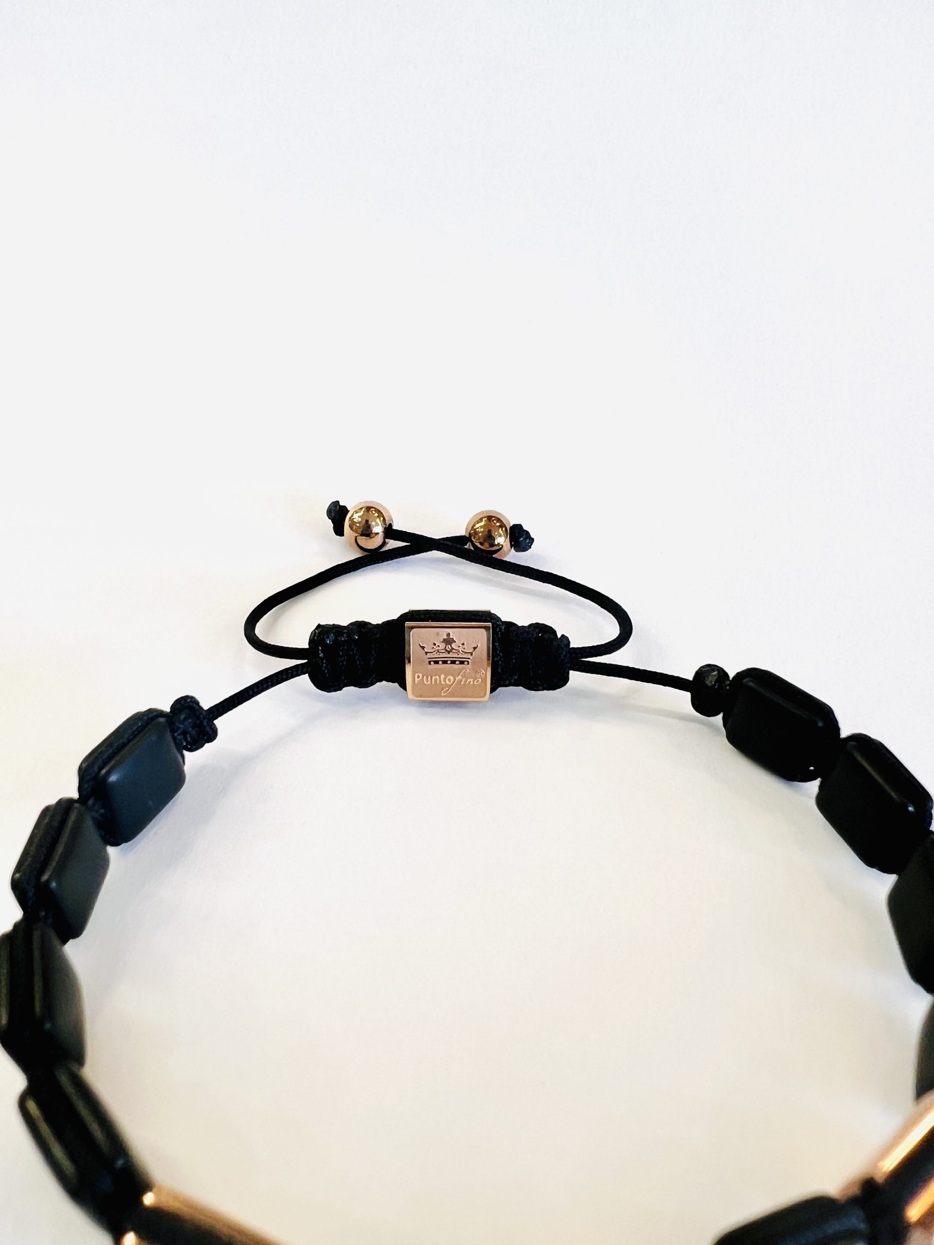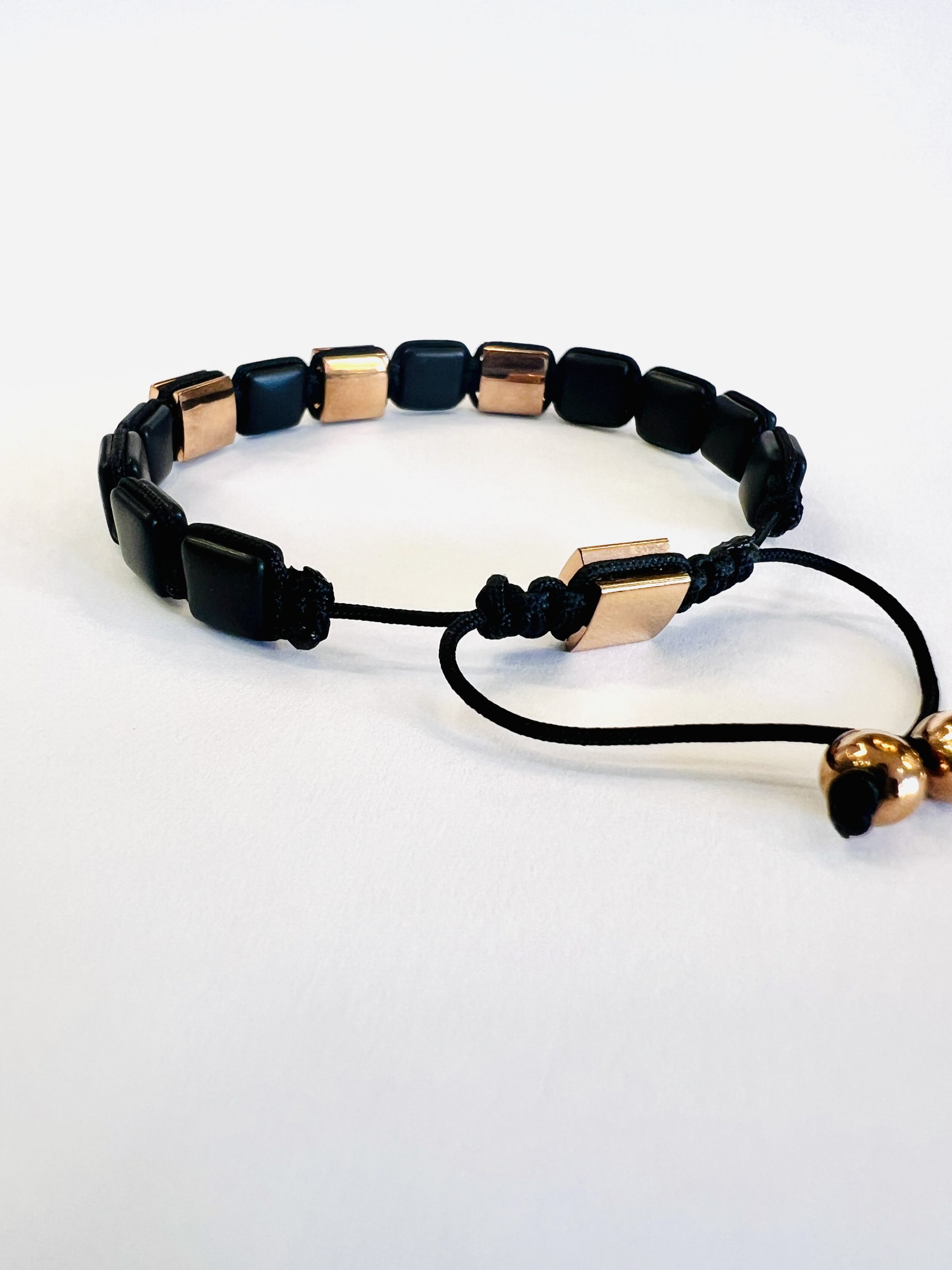 Pulseira de fio preto, ajustável, em aço e quadrados rose gold e pretos.