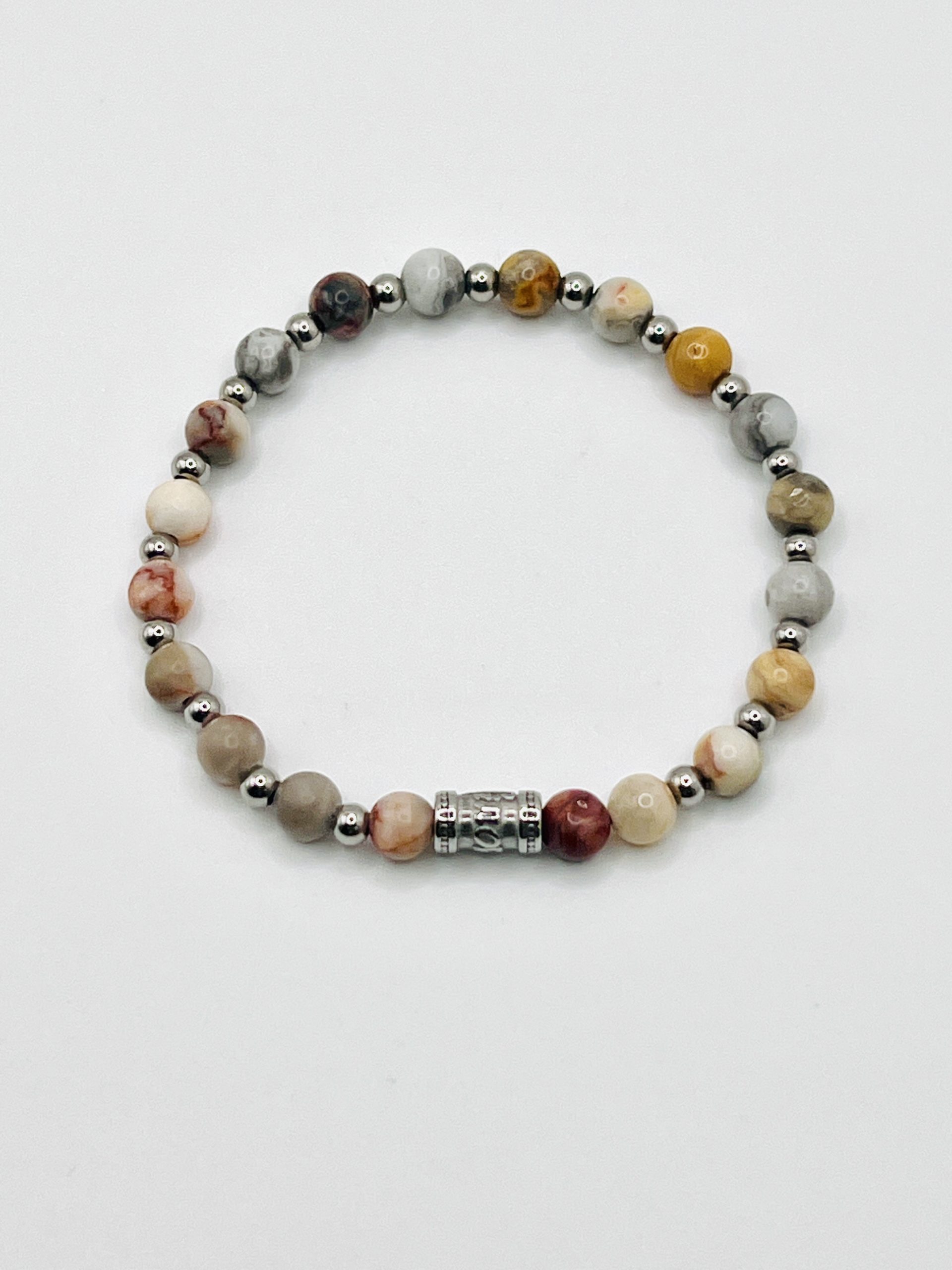 Pulseira elástica de aço prataeado e peças multicor. Fecho prataeado com gravacao da marca. Elástico invisivel, forte e de cor preta.