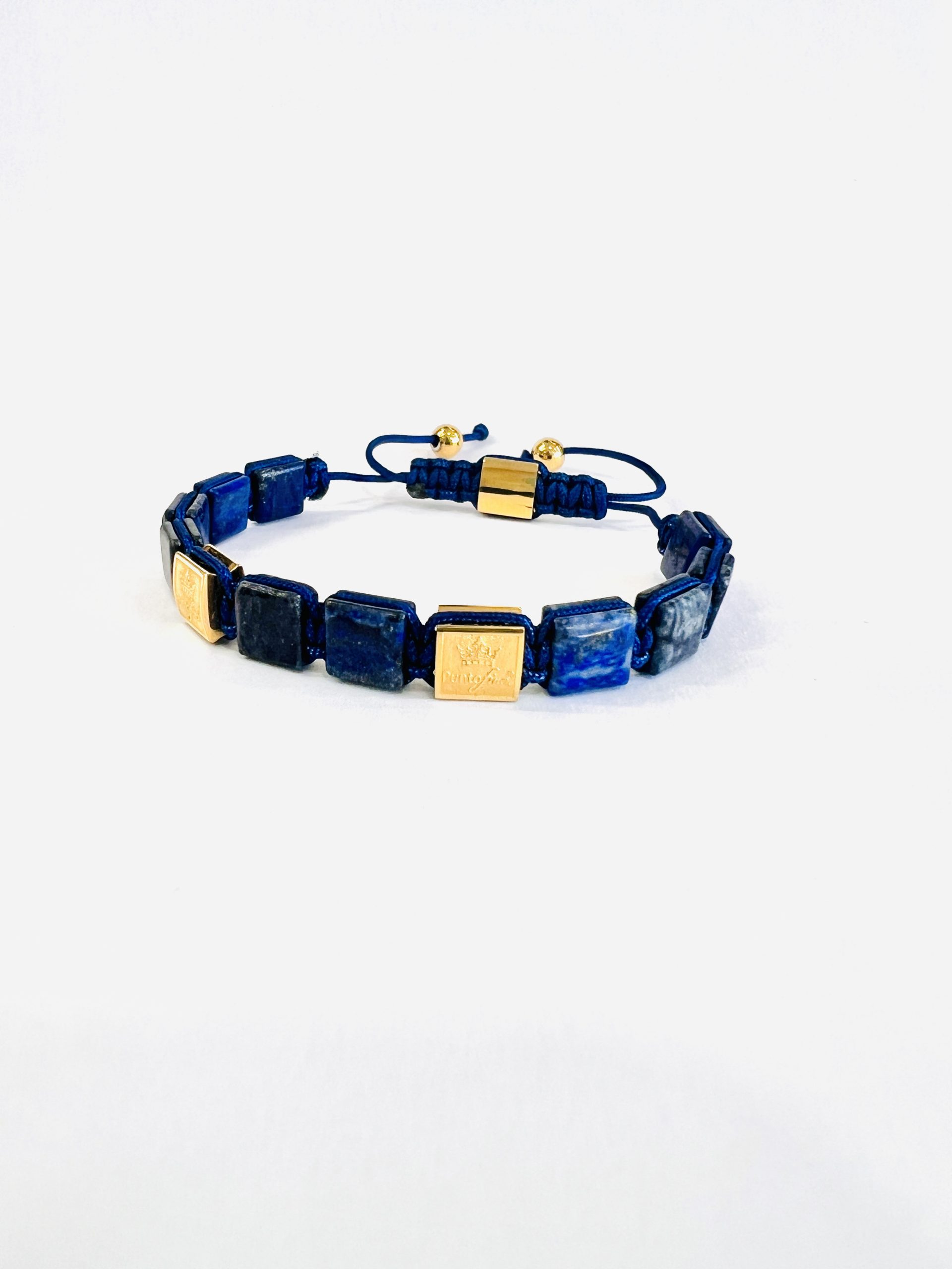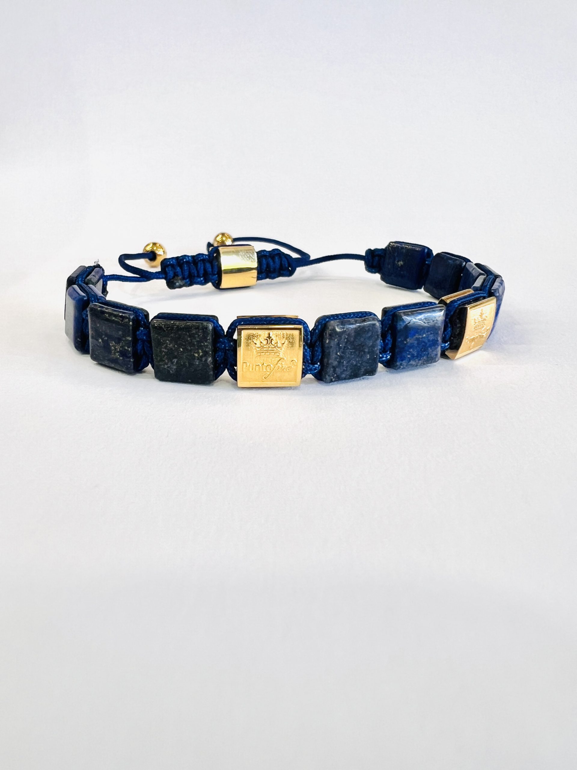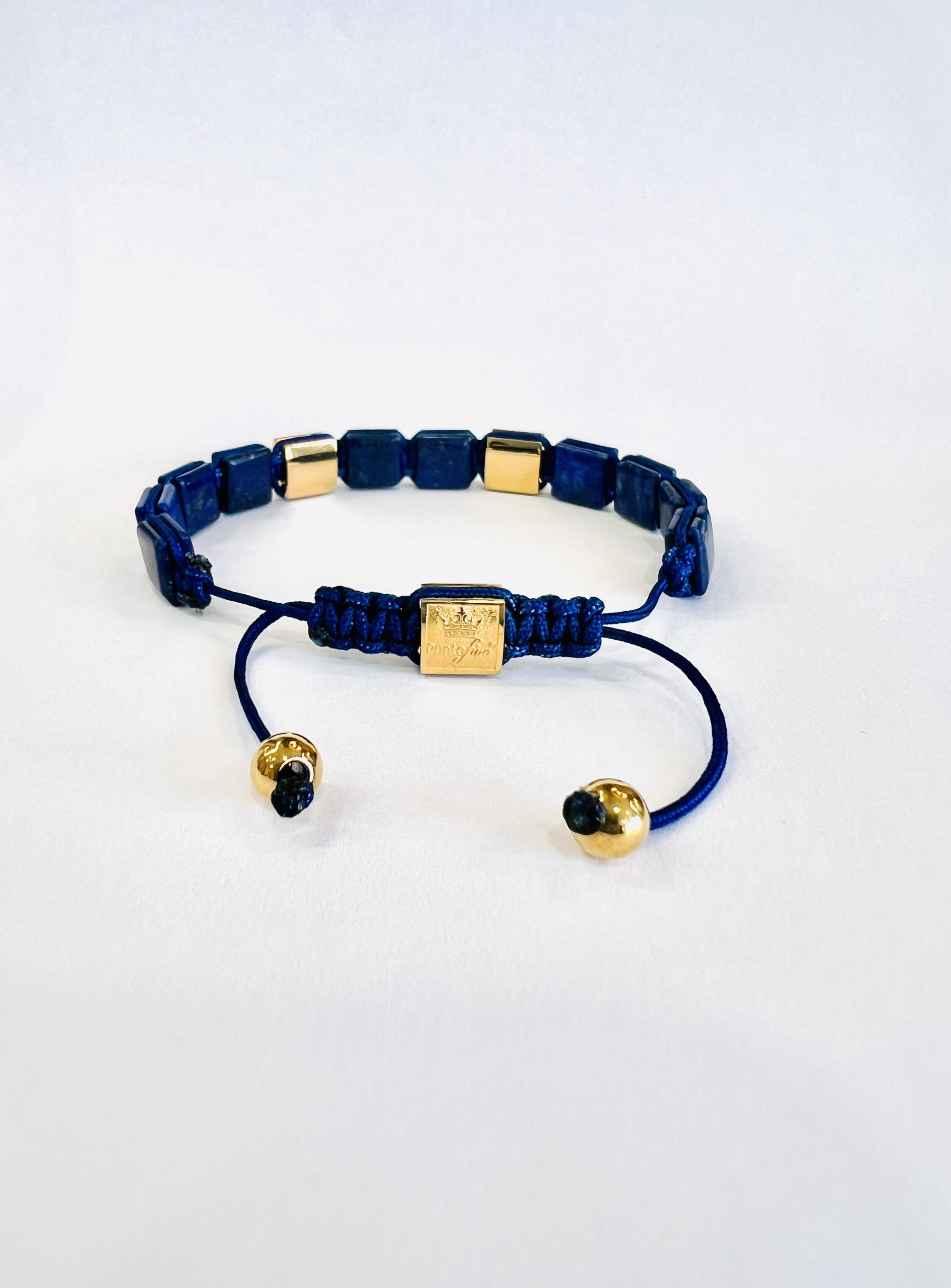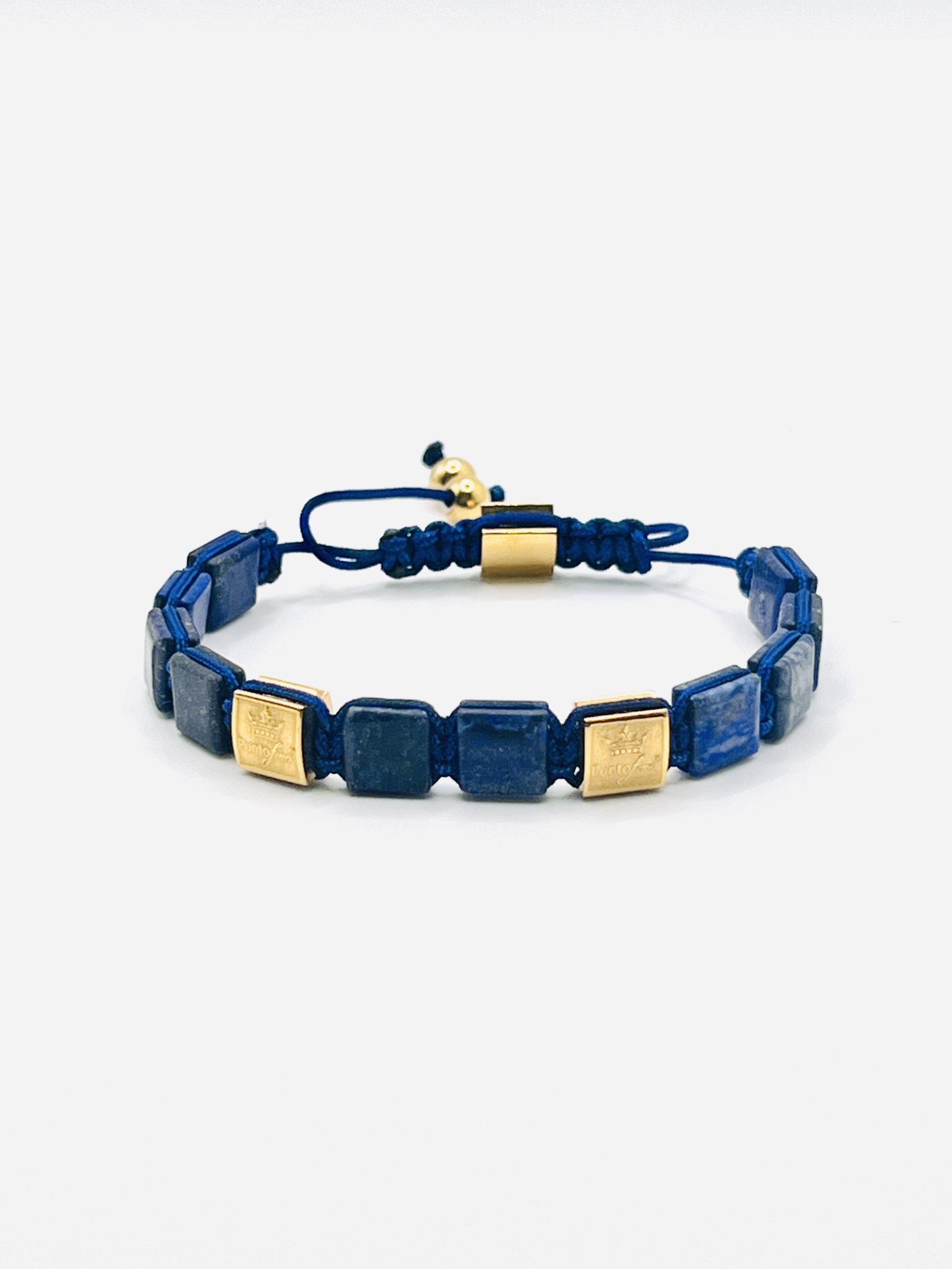 Pulseira de fio azul, ajustável, em aço e quadrados dourados e azuis.