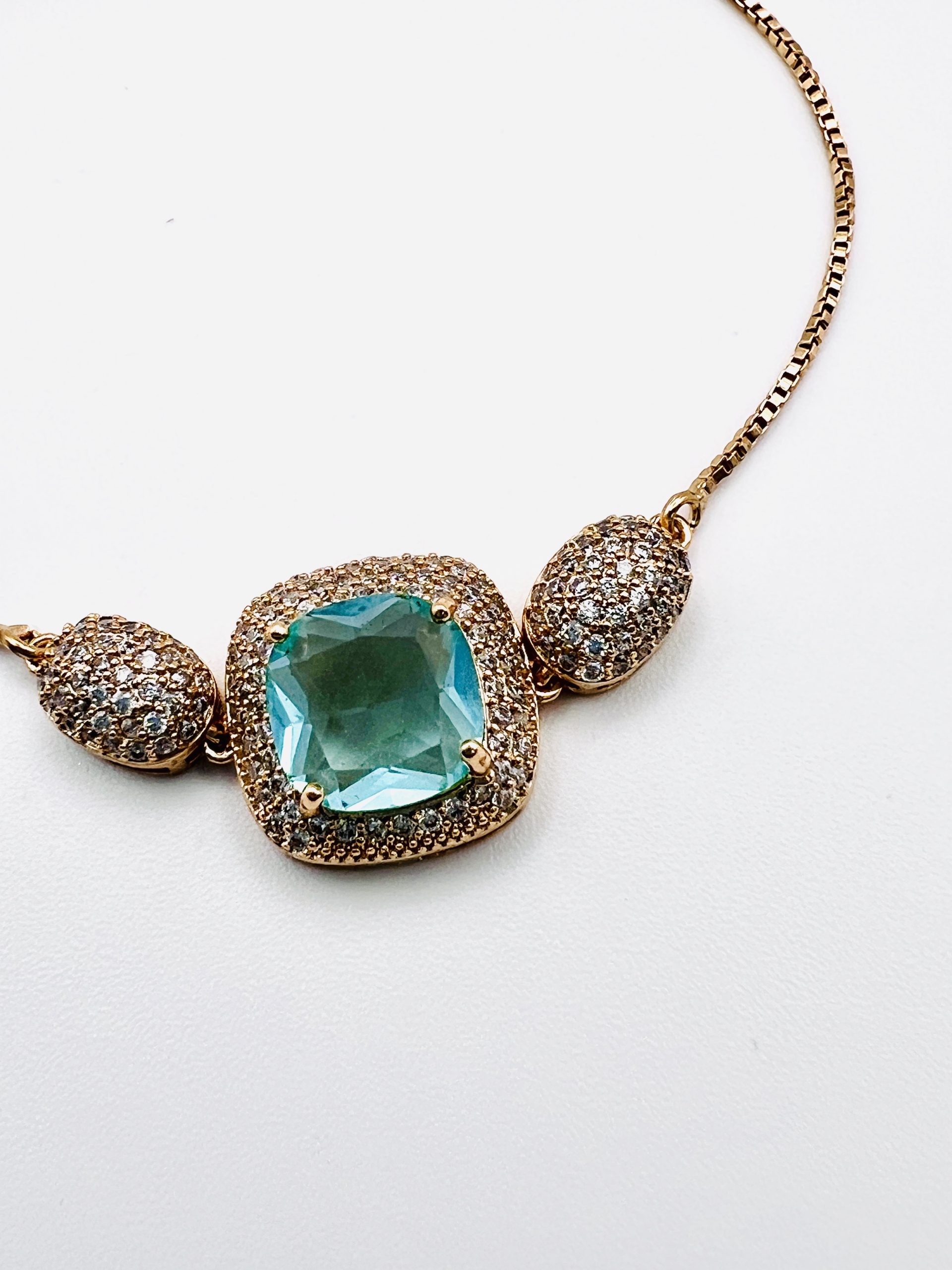 Tem uma pedra central quadrada em verde água e completa com zircónias.
