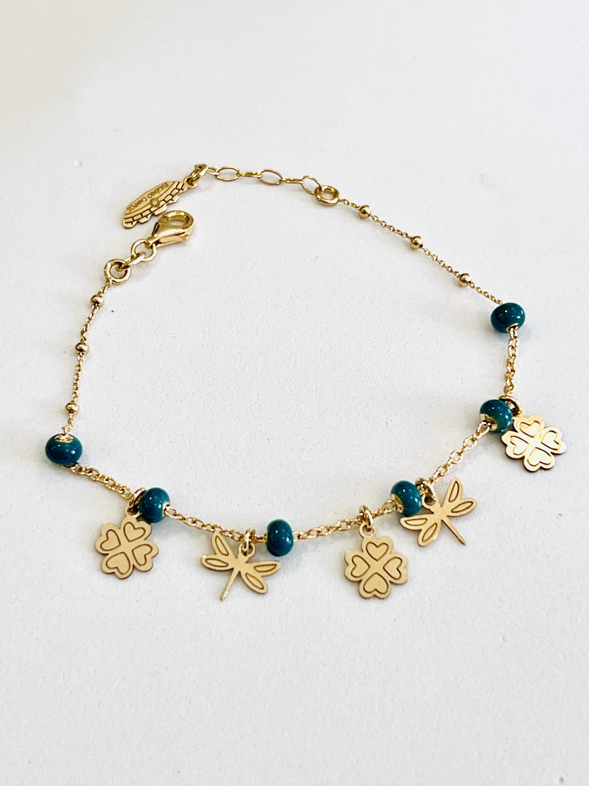 A pulseira Lucky Charms em prata com banho de ouro amarelo. Pendentes libelinha e trevo, com pedras verde natureza.